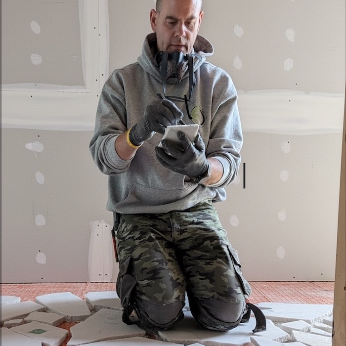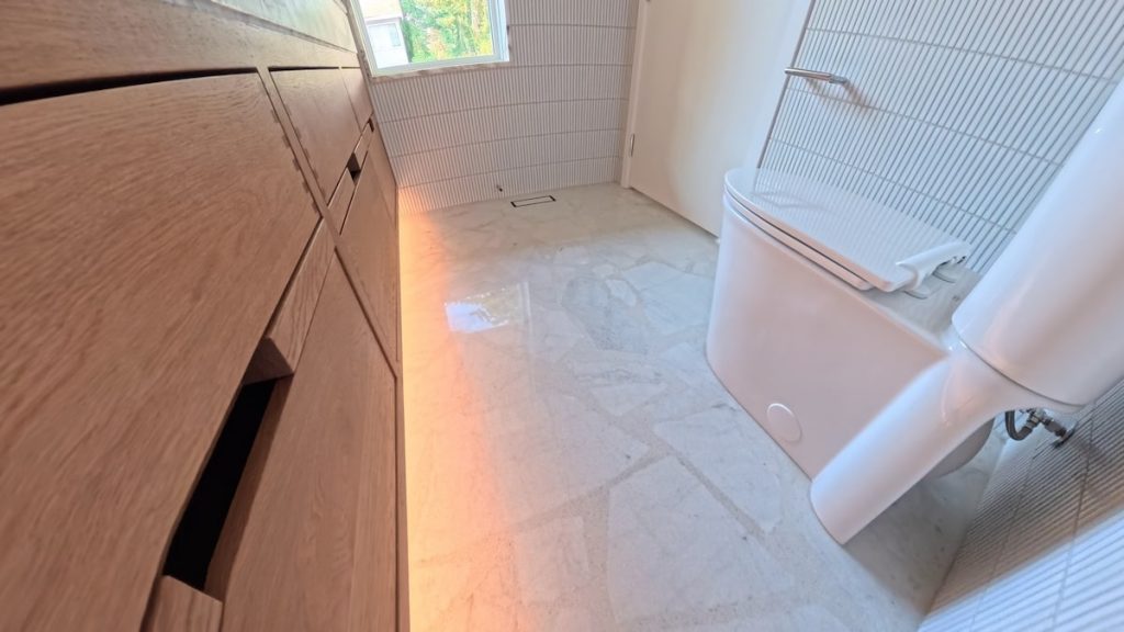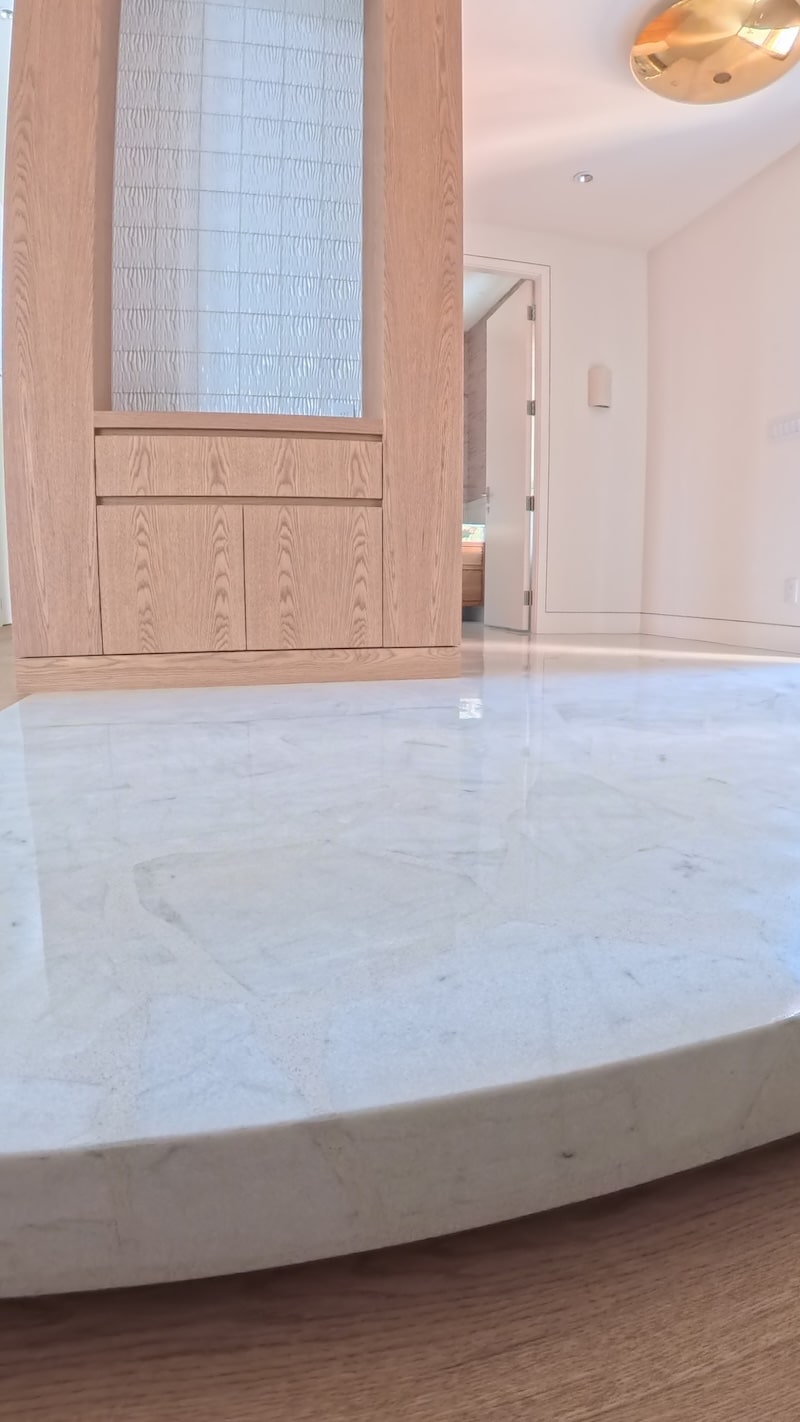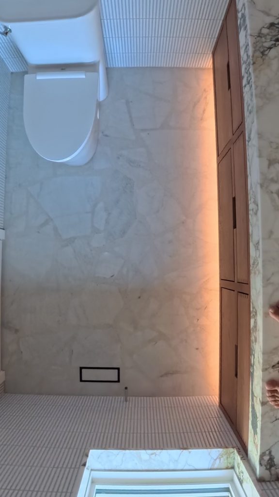 One of the most meaningful aspects of this project was the homeowner’s direct involvement in shaping the floor. They hand-broke some of the marble pieces into forms that resonated with them and even wrote nostalgic, personal messages on the back of select pieces before they were set in place. These hidden notes are now permanently encapsulated within the floor, creating a layer of story and memory that only they know exists.
