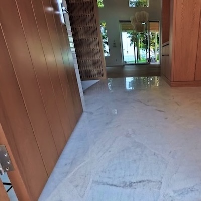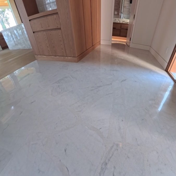 White Vancouver Island marble hand layed in a mosaic pattern and polished out as a seamless floor.