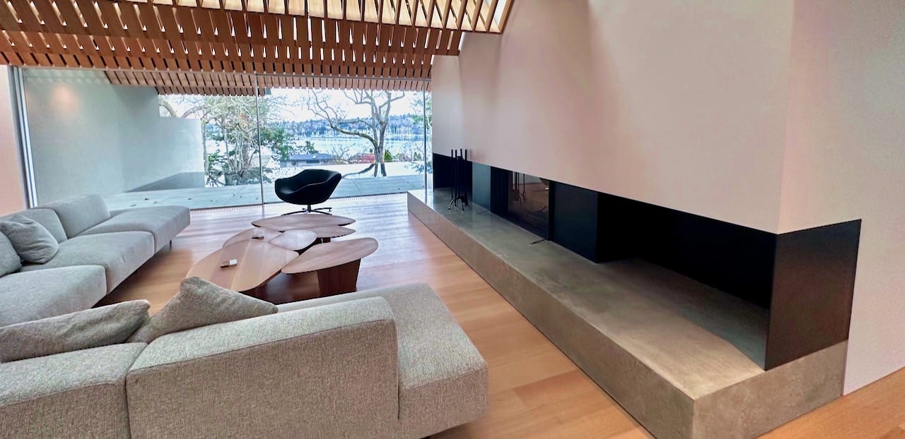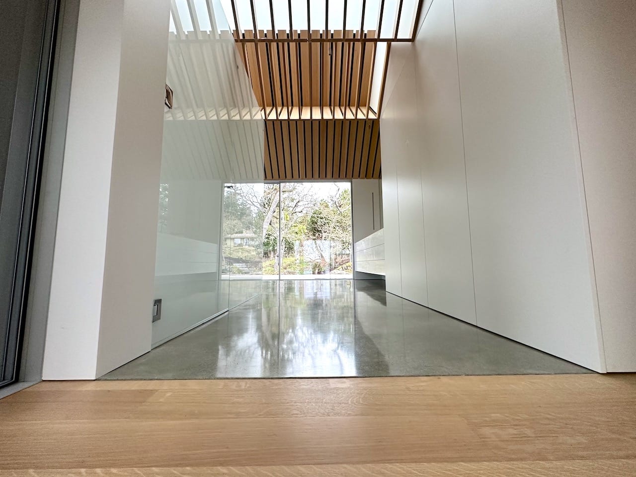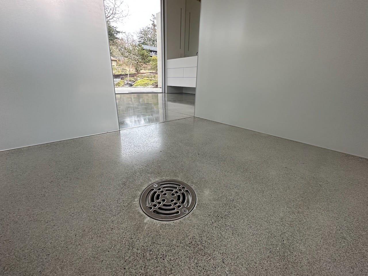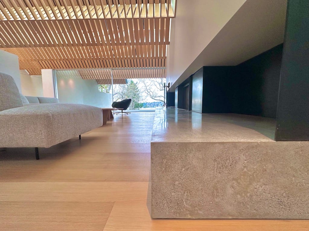 This house designed by Patkau Architects and built by Rannala Freeborn was one of our favourite construction sites to work on. The owners were complete gems and share a mutual love of our favourite medium. Concrete was utilized for all the bathrooms in the house, the fireplace hearth, dog bath and the basement flooring. All the concrete was provided by Butler Concrete, a low aggregate mix was chosen to keep the exposure to a bare minimum. To maintain a minimalist vibe, the grinding and polishing needed to be done slowly, starting with the lightest grit possible. Transitions to all the other flooring materials were near flush, good planning = great execution.