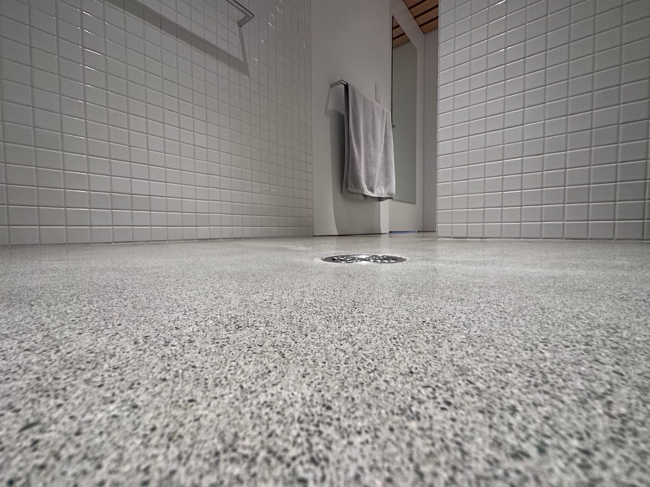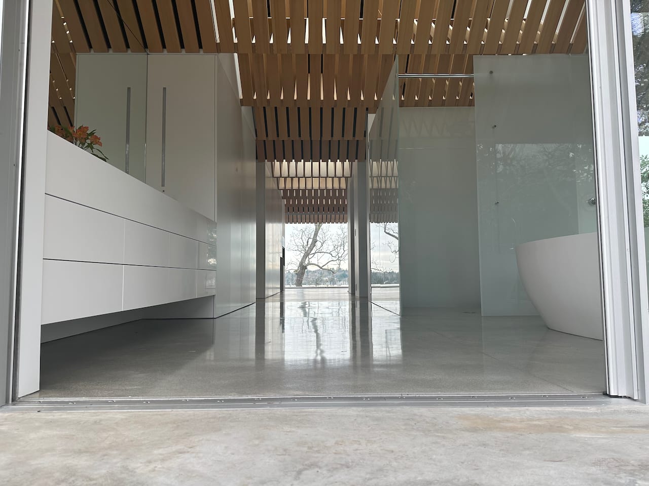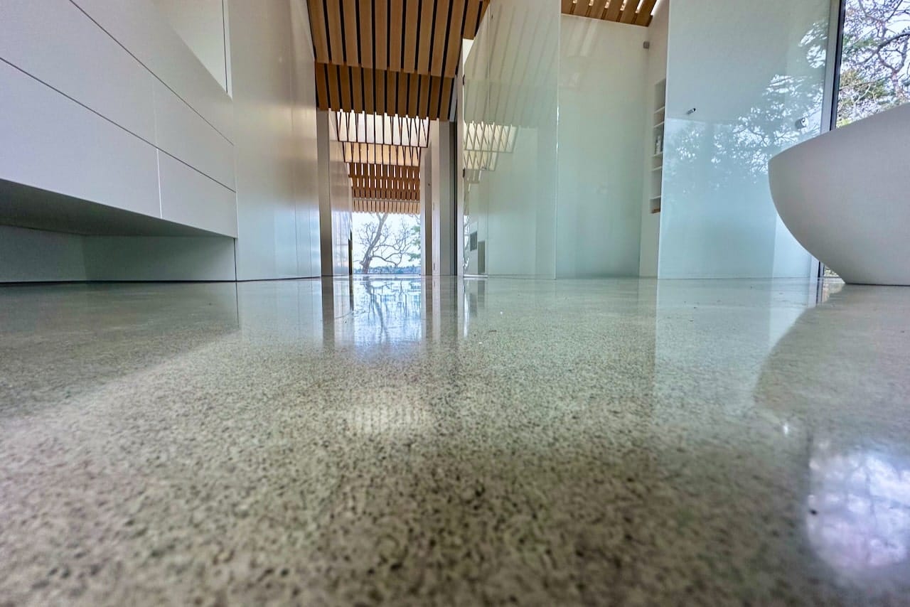 This house designed by Patkau Architects and built by Rannala Freeborn was one of our favourite construction sites to work on. The owners were complete gems and share a mutual love of our favourite medium. Concrete was utilized for all the bathrooms in the house, the fireplace hearth, dog bath and the basement flooring. All the concrete was provided by Butler Concrete, a low aggregate mix was chosen to keep the exposure to a bare minimum. To maintain a minimalist vibe, the grinding and polishing needed to be done slowly, starting with the lightest grit possible. Transitions to all the other flooring materials were near flush, good planning = great execution.