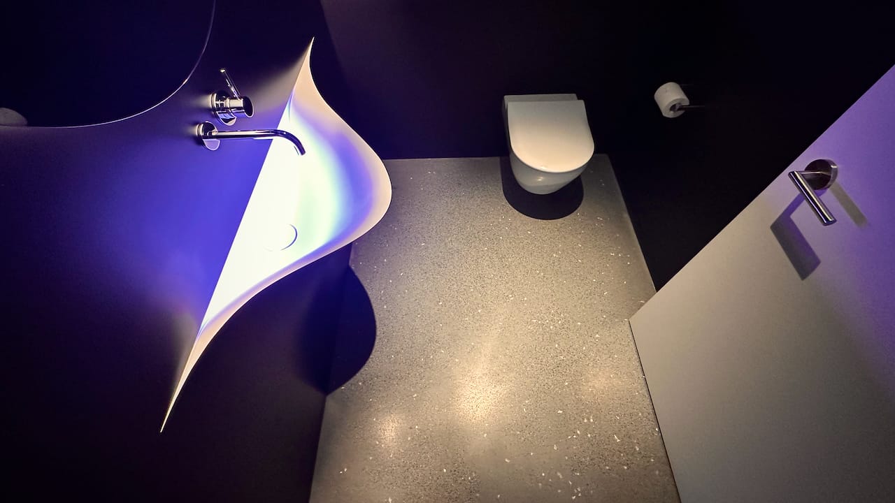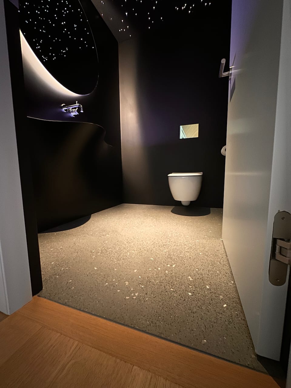 This unique powder room is not as understated as the rest of the house. Inspired by the owners profession as a astrophysicist, the ceiling lights are meant to look like stars and the floor has silver plated glass cast into the concrete to fit the same theme. Ardex k520 with Ti02 and a small amount of blue dye was used as the base colour. Careful attention was made to the floor prep, all cracks were chased and filled with a specialized urethane. The concrete was polished to 800 grit and sealed with two coats of microfilm. The lighting details are quite over the top, and automated.